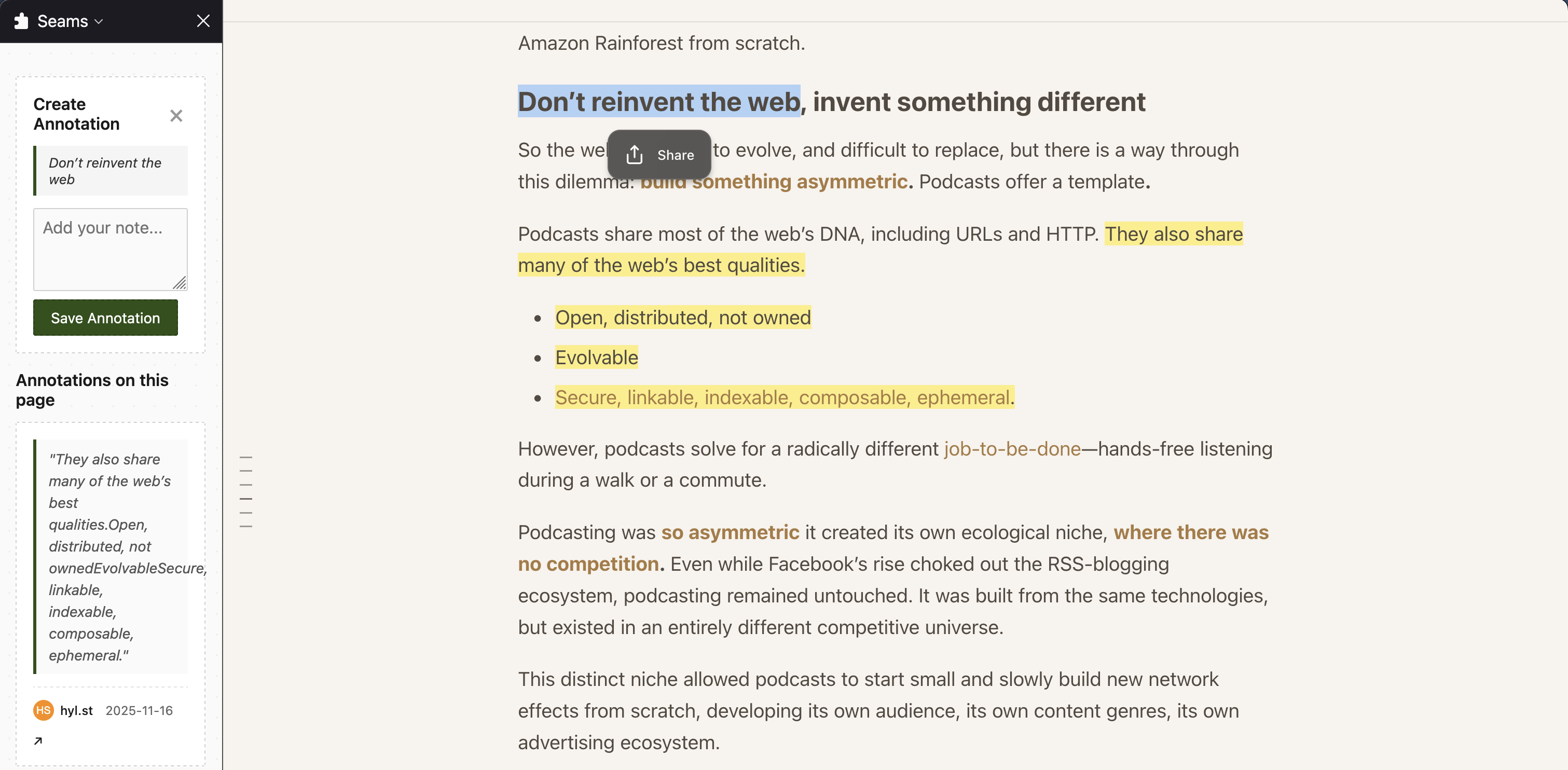 On mobile, you can still annotate by using the proxy: https://sure.seams.so, which is also installable through the PWA, so that it shows up on native Android share screen. Be sure to install it from Chrome, it's the only one that supports the API.